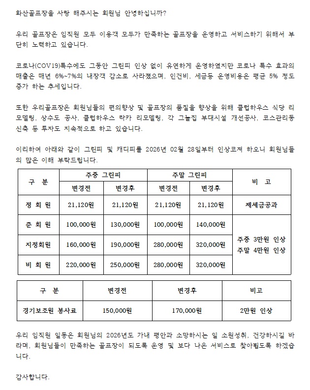 그린피 및 캐디피 인상안내