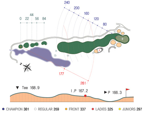 1번홀과 나란히 붙어있는 홀로서 1번홀과 마찬가지로 티 오른쪽에 연못과 폭포를 끼고 있는 완만히 내려가는 홀. 페어웨이 중앙을 따라 정확하게 공략하면 파는 무난합니다.